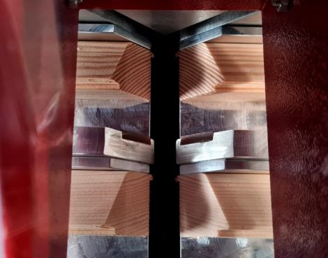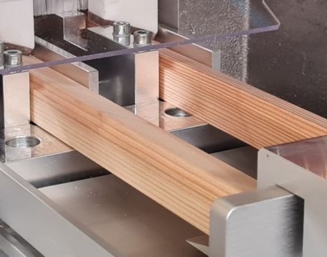 Glasleistensäge für den Zuschnitt von Holzglasleisten im Fenster- und Türenbau. Zuschnitt von gleichzeitig zwei Glasleisten in einer Spannung, Gehrungssschnitte 45/45 Grad.