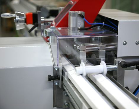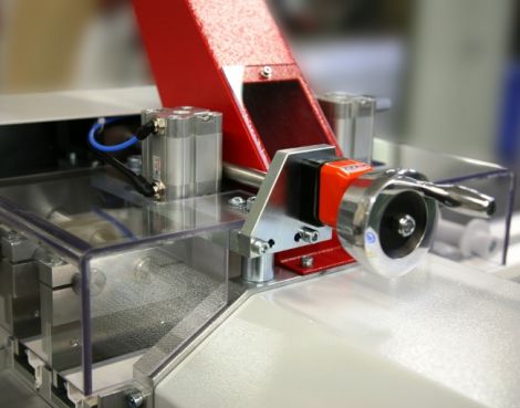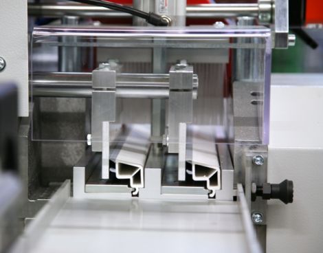 Über Handrad mit Positionsanzeige wird die Glassimulation stufenlos auf die gewünschte Position entsprechend der Profilbreite eingestellt. Zur Seitenführung der Glasleisten vertikal und horizontal ist die GLX Vario mit einer Einlaufrolle als Anti-Kipp-Vorrichtung ausgestattet.
