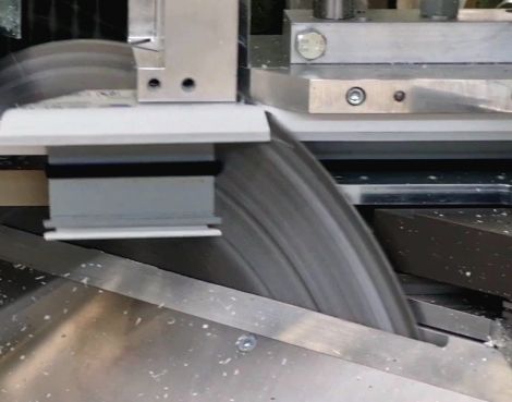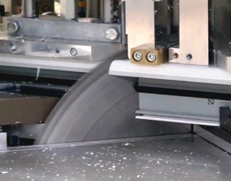 Nach der Bearbeitung wird das Profil zur Untertischsäge befördert, wo 45°-90°-135° Schnitte erfolgen. Auch Zwischnwinkel sind optional möglich.