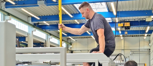 Für die Aufstellung von schweren Trägerteilen der beweglichen Achsen setzt unser Montageteam den elektrischen Kettenzug ein. Mit dem tragfähigen Deckenlaufkran werden die Baugruppen mühelos und millimetergenau positioniert.