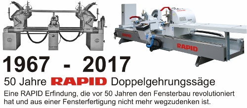 Im Frühjahr 1967 wird von RAPID ein revolutionäres Maschinenkonzept für den Zuschnitt von Fensterprofilen aus Kunststoff, Aluminium und Holz präsentiert, welches von der Fensterbau-Branche mit Begeisterung angenommen wird – Die Doppelgehrungssäge genannt DGS kommt vor fünf Jahrzehnten erstmals auf den Markt und wird auf Anhieb ein Erfolg. Schnell, präzise und wirtschaftlich: eine Kombination, die RAPID Doppelgehrungssägen auszeichnet und bis heute für jeden Fensterbaubetrieb unverzichtbar macht.