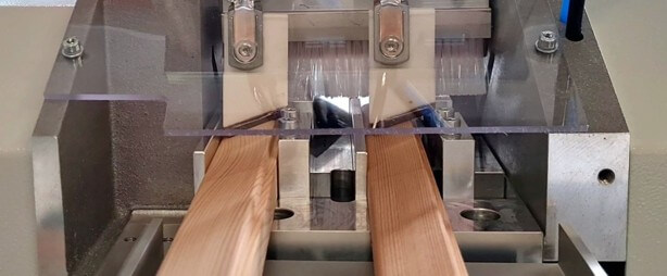 Beim Sägen von gleichzeitig zwei Glasleisten in einer Spannung, Gehrungssschnitte 45/45 Grad, ist die höchste Maß- und Winkelgenauigkeit garantiert.