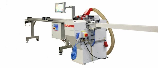 The Vario universal clamping system with a variable two-stage clamping unit with a step less adjustable glass simulation has been specially designed for the cutting of PVC glazing beads in the production of windows and doors. The glazing bead is pulled and clamped at the holding foot. The horizontal clamping plates of the glass simulation straightened up the glazing bead in the position like when glazing bead is "snapped-in". This method ensures a clean look of the window corners.
