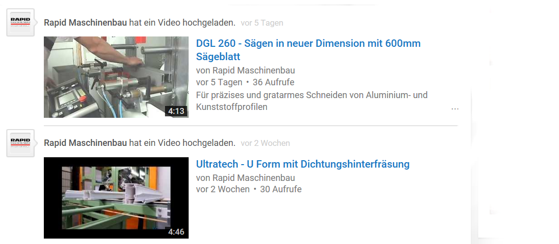 Новые видеофильмы показывают DGL 260, двухголовочную пилу для особо широких профилей с различными полезными опциями, а также RAPID Ultratech U-Form, производственную линию для нарезки и обработки профиля ПВХ. Благодаря вынесенному шуруповёрту, на обрабатывающем центре MFC II можно производить до 120 стандартных окон в смену. Компактное расположение в форме U выбрано, исходя из размеров цеха заказчика и оптимизации технологического потока на его производстве.